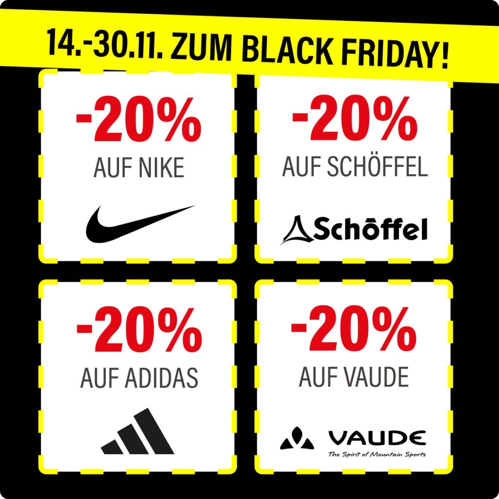 Der frühe Vogel fängt den Rabatt – und Black Friday ist nicht erst Ende November. Bei uns sparst Du ab sofort je 20% auf vier unserer absoluten Topmarken: Nike, Adidas, VAUDE und Schöffel. Komm gleich vorbei und deck Dich für den Winter ein. Die jeweils 20% Rabatt ziehen wir direkt an der Kasse ab.
