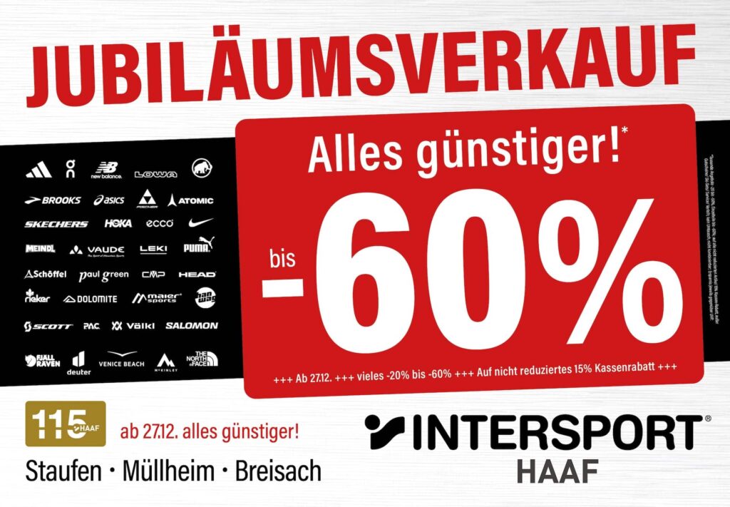 *Jubiläumsverkauf ab 27.12.2025 bis 11.01.2025, alles günstiger, vieles mit 20% bis 50% Rabatt, Einzelteile sogar bis zu 60% günstiger, jeweils bezogen auf den UVP. Auf nicht vorab reduzierte Ware 15% Rabattabzug an der Kasse, ausgenommen Ski-Sets, Gutscheinkarten, Verleih, Service. und Umtausch. Umtausch und Rückgabe ausgeschlossen. 15% Kassen-Rabatt nicht kombinierbar mit anderen HAAF-Rabattaktionen. Gutscheine und Club-Guthaben sind einlösbar. Nicht alle Aktionsangebote in allen Filialen erhältlich, nicht immer alle Farben bzw. Größen verfügbar. Straßenschuhe nur in Staufen, Hauptstraße 66. Alle Preise in Euro inklusive MwSt.