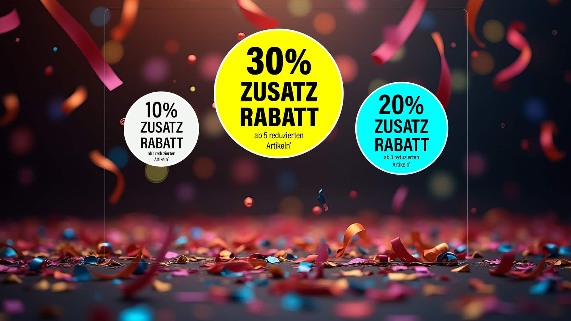 Das ist absolut närrisch: Ab sofort gibt es bei der ultimativen HAAF Lagerräumung auf reduzierte Artikel* bis zu 30% Zusatz-Rabatt. Je mehr Schnäppchen Du willst, desto mehr sparst Du: Auf 1 oder 2 Artikel gibt es 10% Extra-Rabatt, auf 3 oder 4 schon 20% zusätzlich und ab 5 volle 30% Zusatz-Rabatt. Einfach so – und das auf die bereits bis -70% reduzierten Angebote. Rabattabzug an der Kasse! Nur wenige Tage, schau gleich vorbei!